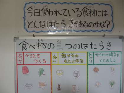 また、給食ではこの3つのグループをバランスよく摂れるように栄養士さんたちが、日々のメニューを考えてくださっている、という話をしました。