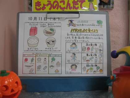 今日は、10月の給食目標の「何でも食べてじょうぶな体をつくろう」について話しました。食べ物は、体の中でそれぞれ大切な働きをしますが、大きく分けて3つのグループに分類されます。1、血や肉をつくったり、歯や骨をじょうぶにする赤の食べ物 2、運動したり遊んだりする力のもとになる黄の食べ物 3、体の調子を整える緑の食べ物 があり赤・黄・緑の食べ物をバランスよく食べることが大切であるという話をしました。