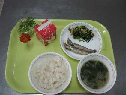 今日の献立は、「麦ごはん、牛乳、ししゃものからあげ、青菜の中華風いためもの、わかめスープ」でした。