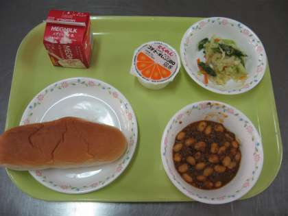 今日の献立は、「味つけコッペパン、牛乳、チリコンカーン、アスパラガスのソティ、みかんゼリー」でした。