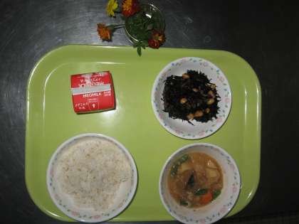 今日の献立は、「麦ごはん、牛乳、煮つけ、ひじき豆」でした。