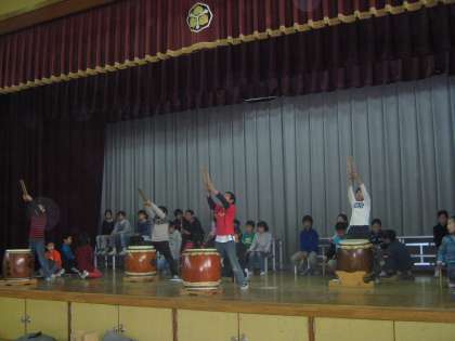 今までは、豊年太鼓・龍神太鼓がそれぞれ時間を区切って音楽室で練習をしていたので、お互いの演技を見合ったのは初めてです。子どもたちは、お互いに良い刺激をもらった様子でした。