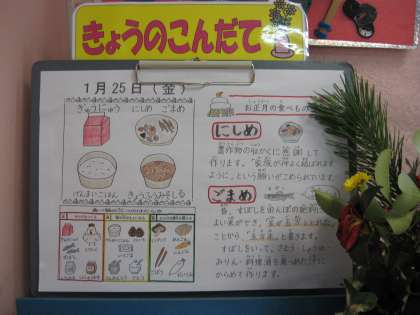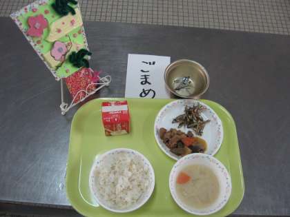 今日の献立は、「玄米ごはん、牛乳、煮しめ、ごまめ、京風みそしる」でした。