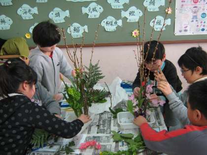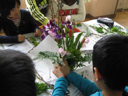 初めての子どもたちがほとんどだったので戸惑いもありましたが,生け始めると初めてとは思えないくらい構成,バランスもよく作品をつくっていました。
