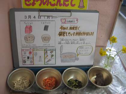 今日は、今年度最後の台風献立として、給食室で保管していた材料で、炊き込み五目ごはんを作りました。