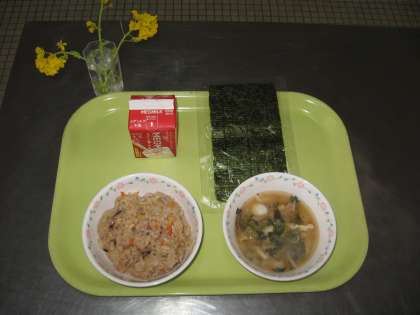 今日の献立は、「炊き込み五目ごはん、牛乳、みそ汁」でした。
