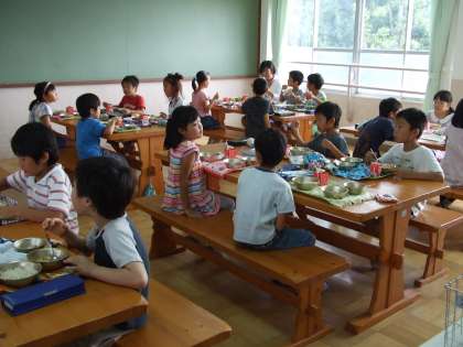 「かむことの大切さ」を教わった後は,ランチルームで石澤先生と一緒に給食を食べ,噛む回数を数えたり,食事のマナーを教わったりしていました。