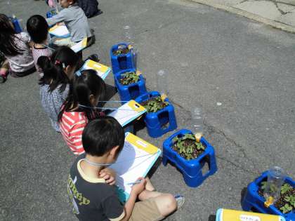 5月12日にまいたあさがおの種が16日には芽を出し始め,19日には双葉がたくさん見られました。1番お気に入りの双葉をしっかり観察し,真剣に絵で記録していました。色々な発見があり,細かいところまでよく見ていることに驚かされました。