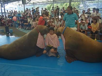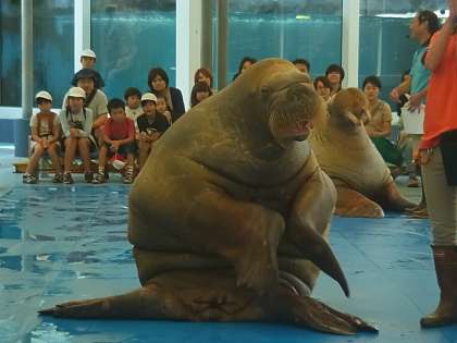 セイウチパフォーマンス笑(ショー)では,セイウチからのキスをプレゼントしてもらいました。