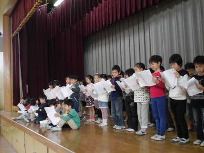1・2組合同で体育館の舞台を使って,読み合わせをしました。教室で読んでいるのとは違い,大きな場所では自分が思っているより声が届かないことを感じたようです。まずは,大きな声で読む習慣をつけ,慣れてきたら抑揚やテンポ,セリフの間などに目を向けられるようにしていきたいと思っています。