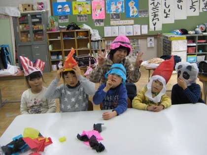 手品では、次々と、帽子やお面が紙の中から登場してきて