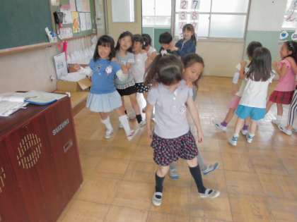 拍を感じてリズムを打つ学習で,「しろくまのジェンカ」という曲で体を使って学習しました。「たん うん たん うん たん たん たん うん」のリズムで,みんなで踊りました。最高の笑顔で楽しみながら学習ができました。