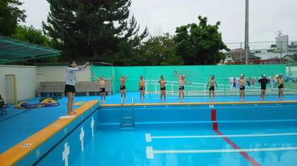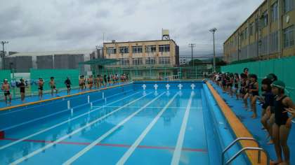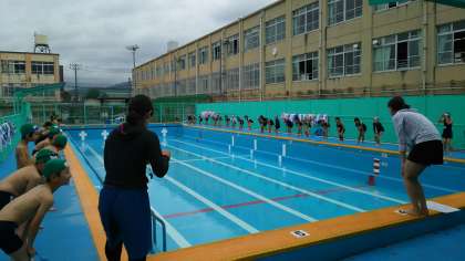 低学年の低水位から、始めます。曇り空ですが、子ども達は張り切って準備運動しています。安全に気を付けながら、水泳学習にのぞみます。