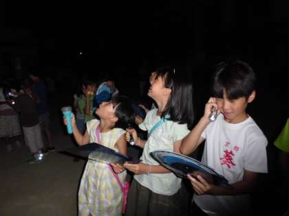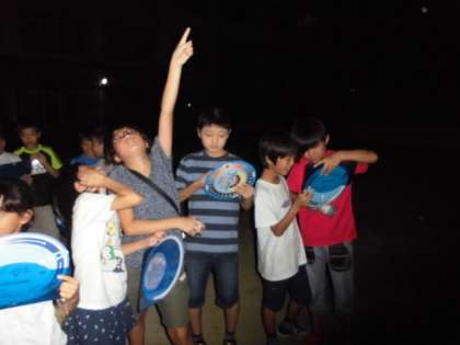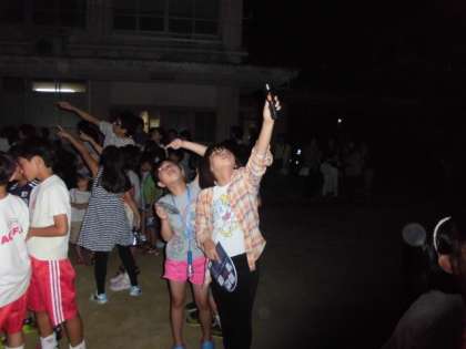 4年生は理科で星についての学習をしています。7月19日の夜に学校へ集まり,スターウオッチングを行いました。北極星,北斗七星,夏の大三角などの位置を星座早見盤で確かめ,空を見上げて探しました。また,天体望遠鏡や双眼鏡で,土星や満月を観察しました。月の模様や土星の環(わ)には,子どもたちや引率の保護者の方々から歓声があがっていました。