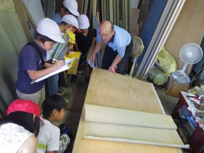 生活科の学習で葵校区にある畳屋さんにお世話になり,グループで探検に出掛けました。子どもたちは,畳の材料や種類を聞き,三種類もあることに驚いていました。また,材料である「いぐさ」を実際に触らせてもらったり,においを嗅いだりしました。伝統を伝えたいというご主人の思いを聞き,それぞれ感じとったことがあったようでした。
