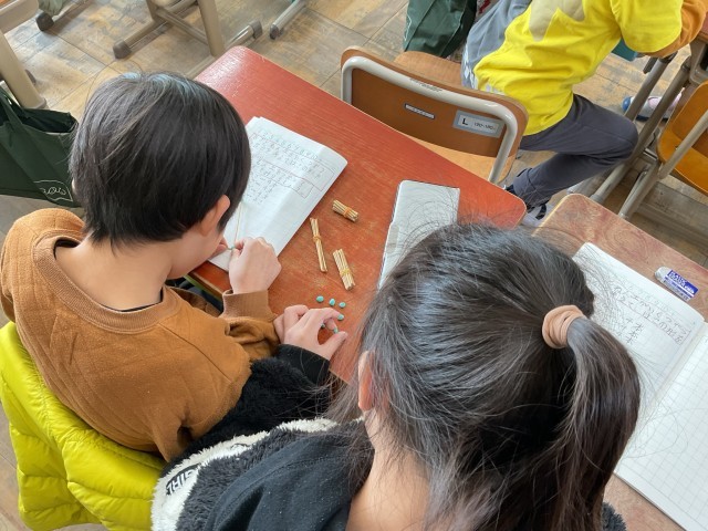 2年生は算数で「はこの形」の学習をしています。ひごと粘土玉を使って実際に立体の枠を作り、辺や頂点のつながりを確かめました。友だちと協力しながら形を組み立てる中で、立体の特徴を楽しく理解することができました。