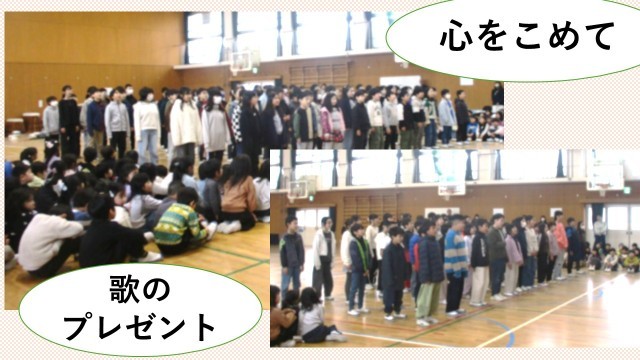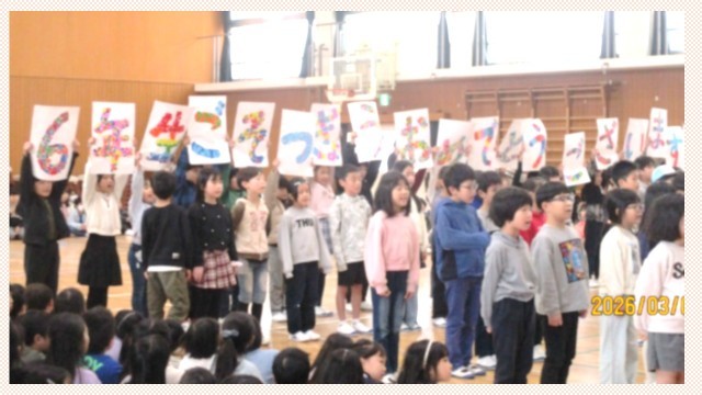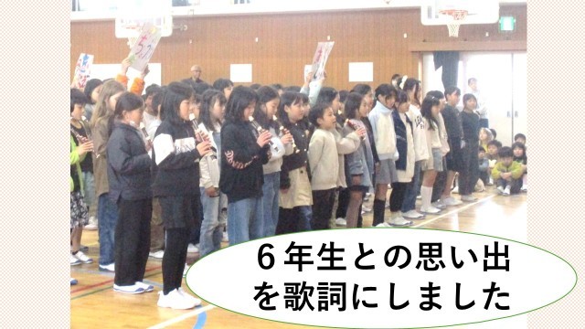 『6年生を送る会』を行いました。1-5年生が拍手で迎える中、6年生が1人ずつ入場し、舞台に作られた段に並びました。各学年から、お世話になった6年生に向けて歌や演奏を披露しました。