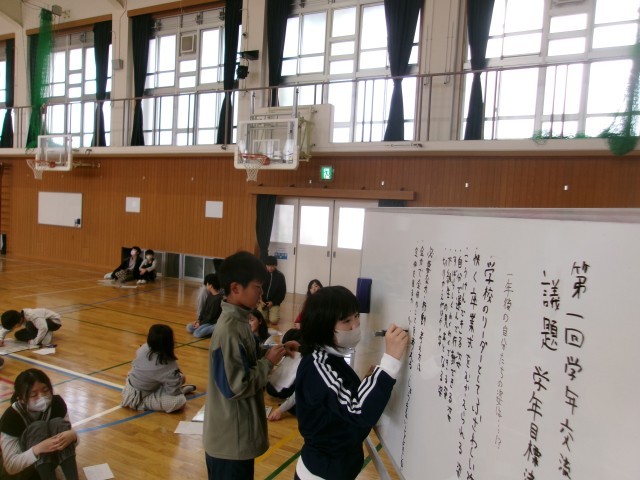 6年生で学年集会を行いました。今日は、自分たちで学年目標を考える時間です。