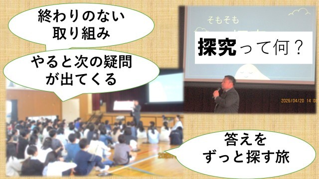 5・6年生全員が体育館に集まって、2026あおいカレッジ(異学年探究学習)開きをしました。まずは、「そもそも『探究』とは何か?」という問いが校長先生から投げられました。すると、「終わりのない取り組み!」「自分の疑問に対して自分なりの答えが出るまで調べる。また疑問が出て…ぐるぐる回るもの」「興味のあることについて、とことん追究していくもの!」と、どんどん子どもたちから出てきました。これだけ「探究」を理解し、言語化できることに本当に驚き、感動した場面でした。