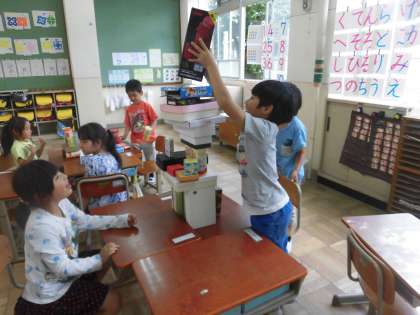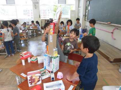 家から持ってきた箱や空き缶を持ち寄って,いろいろなものの形を作る活動を楽しみ,図形の特徴をとらえたり形の機能に着目したりする学習をしました。