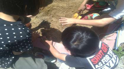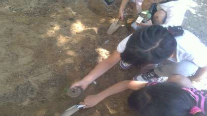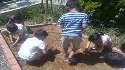 5月にまいた植物の種が芽をだし、大きくなってきたので、観察の後に植え替えをしました。花壇の土をみんなでまぜまぜ、やわらかくしてから、植えかえました。
