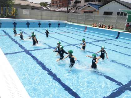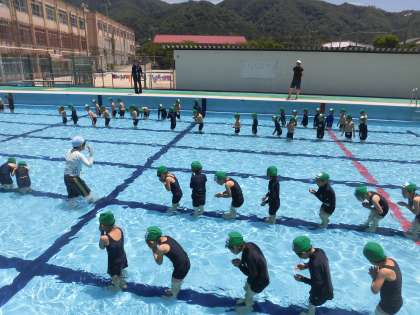 学校のプールに入るのは初めてのことなので,靴の履き替えや水に入る前の注意など確認しながら進めました。