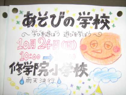 24日(日)午前10時より「あそびの学校」を行います。PTAが中心になり、地域の方々のご協力を得、子どもたちのために「あそび」を考え、子どもたちとともに遊びます。皆さんのお越しをお待ちしています。子どもたちと一緒に1日楽しく遊びましょう。