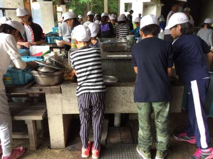 午後3時からは,野外炊事に入りました。今回は,飯盒でご飯を炊き,お鍋でカレーを煮込みます。各グループに調理道具一式が配布され,それぞれに準備を始めました。おいしいカレー作りがスタートしました。