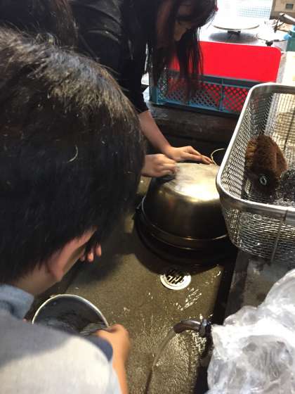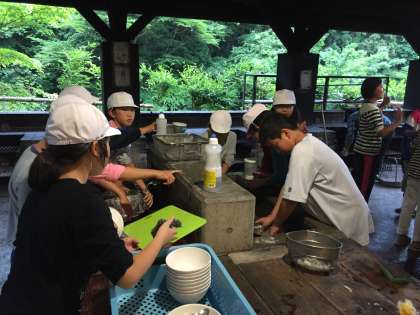 食べた後は,片付けです。真黒く焦げた大鍋を一生懸命こすってきれいに仕上げました。また,内側もスポンジでしっかりこすりました。「来た時よりも美しく」まさに,山の家の醍醐味です。みんな頑張って後始末をしました。
