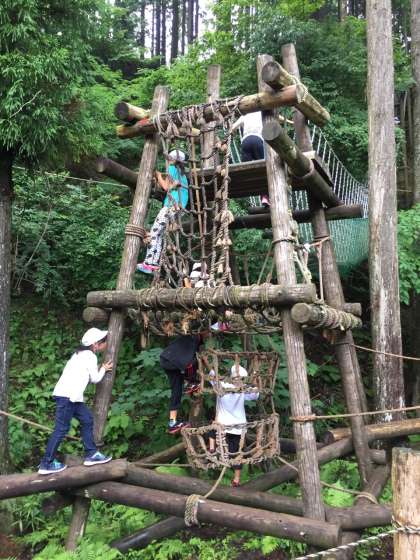 朝食後,荷物整理を終え,2グループに分かれ,活動を開始します。Aグループは,子どもたち待望の「冒険の森(アスレチック)」です。楽しくてスリルのあるアスレチックに挑戦します。活動開始の合図を聞くと同時に入場し,鎖のつり橋や,丸太渡りを楽しみました。