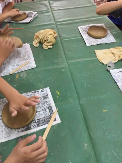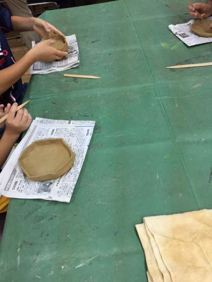 それぞれに工夫を凝らしたお皿が次々に仕上がってきました。薄すぎても分厚くすぎても,焼いている時に割れる可能性があります。山の家活動記念として,日付を刻む子どもや,好きなイラストを刻む子どもなどの,楽しいお皿が出来上がってきました。お皿が焼きあがって,自分たちの手に渡るのは,2〜3か月後になります。出来上がりが楽しみです。