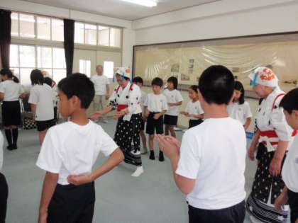 総合的な学習の時間「調べよう 修学院校区の祭り」の学習で、修学院で古くから受けつがれている紅葉音頭について学習しました。紅葉音頭保存会のみなさんをゲストティーチャーに迎え、紅葉音頭の歴史の話を聞いたり、踊り方を教えていただいたりしました。