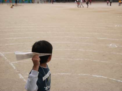 自作の紙ひこうきをどのくらいとばせるでしょうか。今日は風があるので,とばすタイミングも重要なようです。(担当:安全委員会)