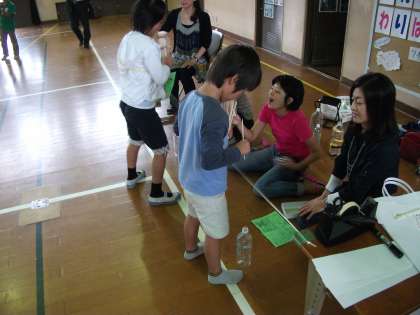 割り箸を上から落として下にあるペットボトルに入れます。上手に入るかな?(担当:2年学年委員)
