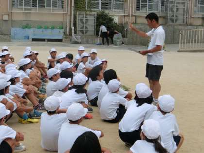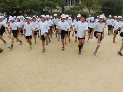 月曜日の体育の時間には,中島先生に速く走るためのコツを教えていただきました。また,簡単なメニューを通して実際に体を動かし,正しいフォームで走ることができるように練習しました。まずは,腕振りから始まり,もも上げをしています。
