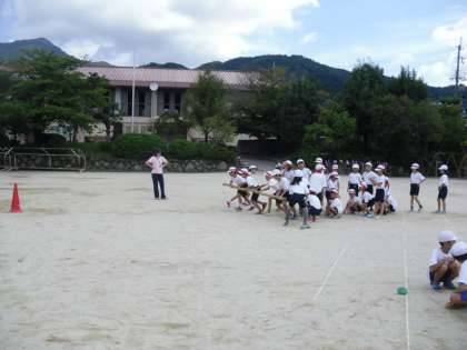 3年生の団体競技は、台風の目です。4人で棒を持って、コーンの回りを大回転しながら走ります。最後は仲間全員の足の下に棒をくぐらせ、頭上を通って次の走者たちと交代します。