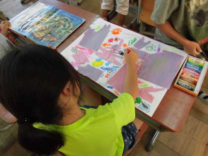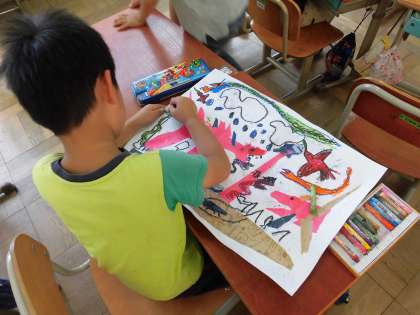 今日は,先週に作ったやぶいた紙を糊付けしたものにバスで描き足したり小さな紙片を貼り付けたりして,作品を仕上げました。怪獣にのっている自分や周りの景色など,楽しんで付け足していました。作品を見せながら,絵の世界のお話をする姿が1年生らしく,かわいかったです。