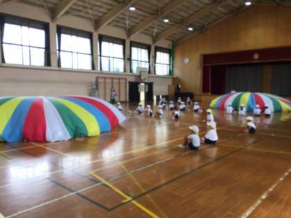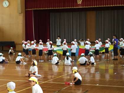 その中で,低学年の取組についてお伝えします。1年生の団体競技は,「力を合わせデカパンでGO!!」です。子どもたちは各色に分かれ,2人組になって,デカパンをはいて走ります。なかなかうまくいかず,失敗もありますが,みんな楽しそうに進めています。一方,体育館では,2年生が「ポップスター 輝く星になれ」と題する団体演技に取り組んでいます。他校から調達したバルーンの使用も見どころの一つです。色とりどりのバルーンが子どもたちの演技を盛り上げてくれます。