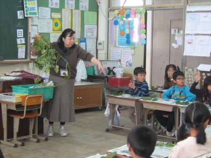 その前の11月5日(金)に栄養教諭の岸本先生から「さつまいもについて知ろう」として、さつまいもについて学びました。さつまいもにはビタミンCなど体に良い栄養がたくさんあること、いもだけでなく、葉や茎も食べられることなどを教えてもらいました。実際に葉を使って、茎の筋むきなども体験しました。また、さつまいもを用いた料理はとてもたくさんあることも知りました。とても内容のある1時間の学習でした。