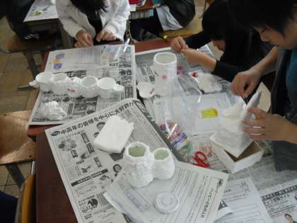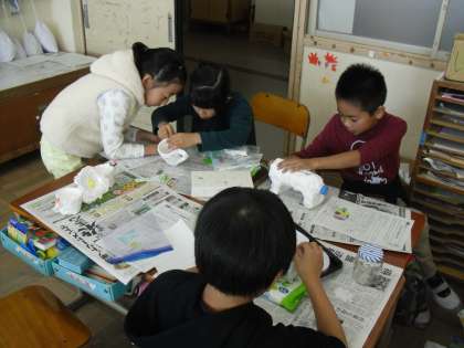 おうちで用意してもらった容器に紙粘土をはって、思い思いの小物入れを作っています。子どもたちは、形や用途にこだわって、楽しく活動に取り組んでいました。