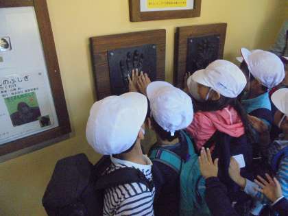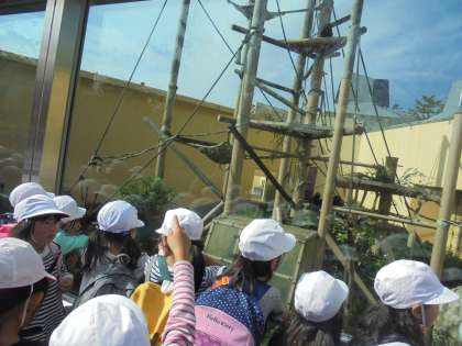 ゴリラの手の模型に触れたり、さるのものまねをして楽しんでいる児童もいました。