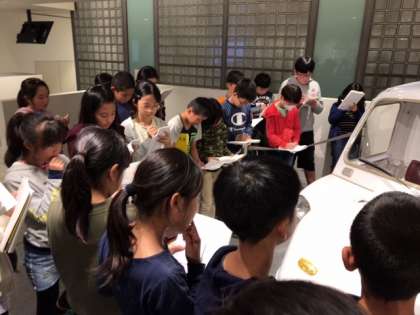 これまでにダイハツが発明した車の見学をしました。見慣れない車に子どもたちも興味がいっぱいです。