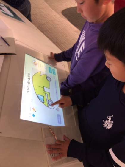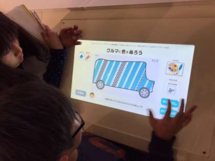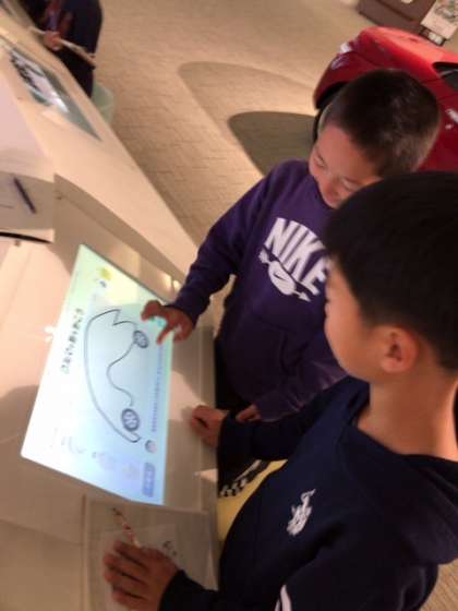 車のデザイン,軽自動車の設計をゲーム感覚で楽しめるスポットがあり,子どもたちはそれぞれ,自分たちの好きなデザインや色で様々な車を作成していました。