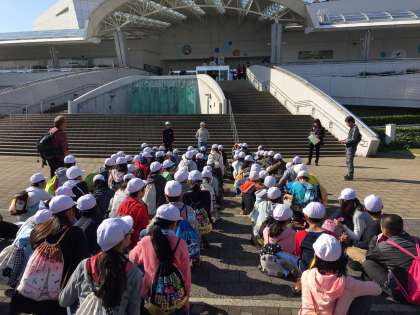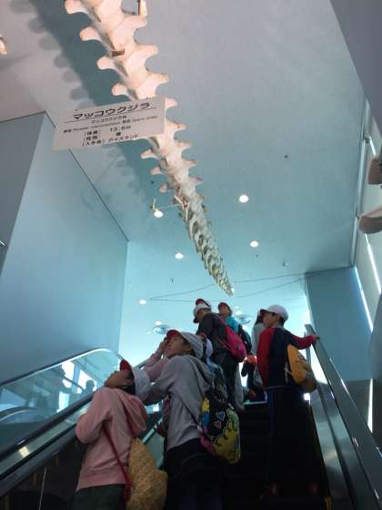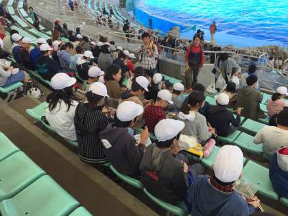 名古屋港水族館に着きました。入り口で、水族館の見どころを確かめて、いよいよ入館。まずは、イルカスタジアムで昼食です。