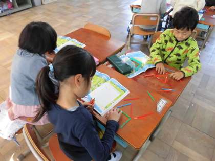 今日は,棒でかたち作りをしました。見本を見ながら,楽しく活動できていました。