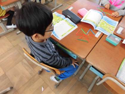 今,算数科では,図形の構成をとらえることを目標に,色板や棒を使って見本と同じ形を作る学習をしています。色板を並べてかたちを作る学習では,見本に色が付いていると作りやすいようでしたが,見本が影になると,どこが色板の分かれ目なのかを見つけることが難しく,時間をかけてじっくり考えている子が多かったです。
