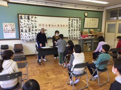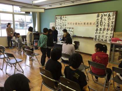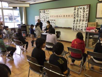 画仙紙に力強く書いた書初めが,今週,子どもホールに展示され,本日,同窓会より表彰していただきました。子どもたちにとっては,大先輩である同窓会の会長さんから直接,賞状をいただきました。同窓会の方々には,3月の卒業式前に,築山清掃もしていただく予定です。