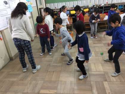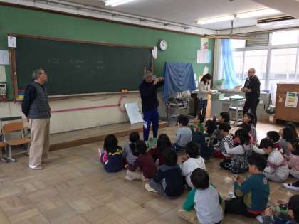 1年生では,同窓会の方々をゲストに招き,「昔遊び」を体験しました。コマ回しやおじゃみ,めんこにあやとりなど,日常ではあまりなじみのない「昔遊び」に,子どもたちは四苦八苦しながらも,おもしろさを感じ,楽しい時間となりました。