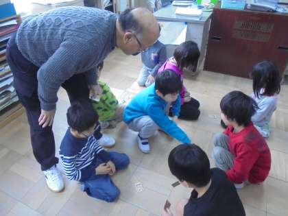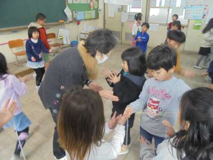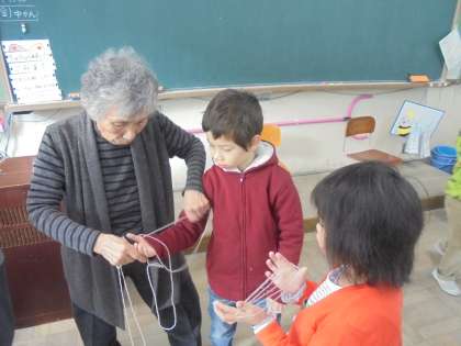 1・2時間目,同窓会の方々をゲストティーチャーとしてお招きし,昔の遊びを教えていただきました。この日までに,少しは練習していたのですが,なかなかコツがつかめず,うまくできない子も多くいました。今日は,コツを教えてもらったり一緒に遊んでもらったりする中で,初めてできるようになった子もいました。