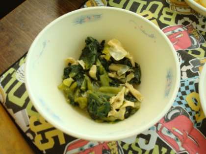 けずりぶしを使っただし汁と一緒に小松菜とゆばを味わいました。